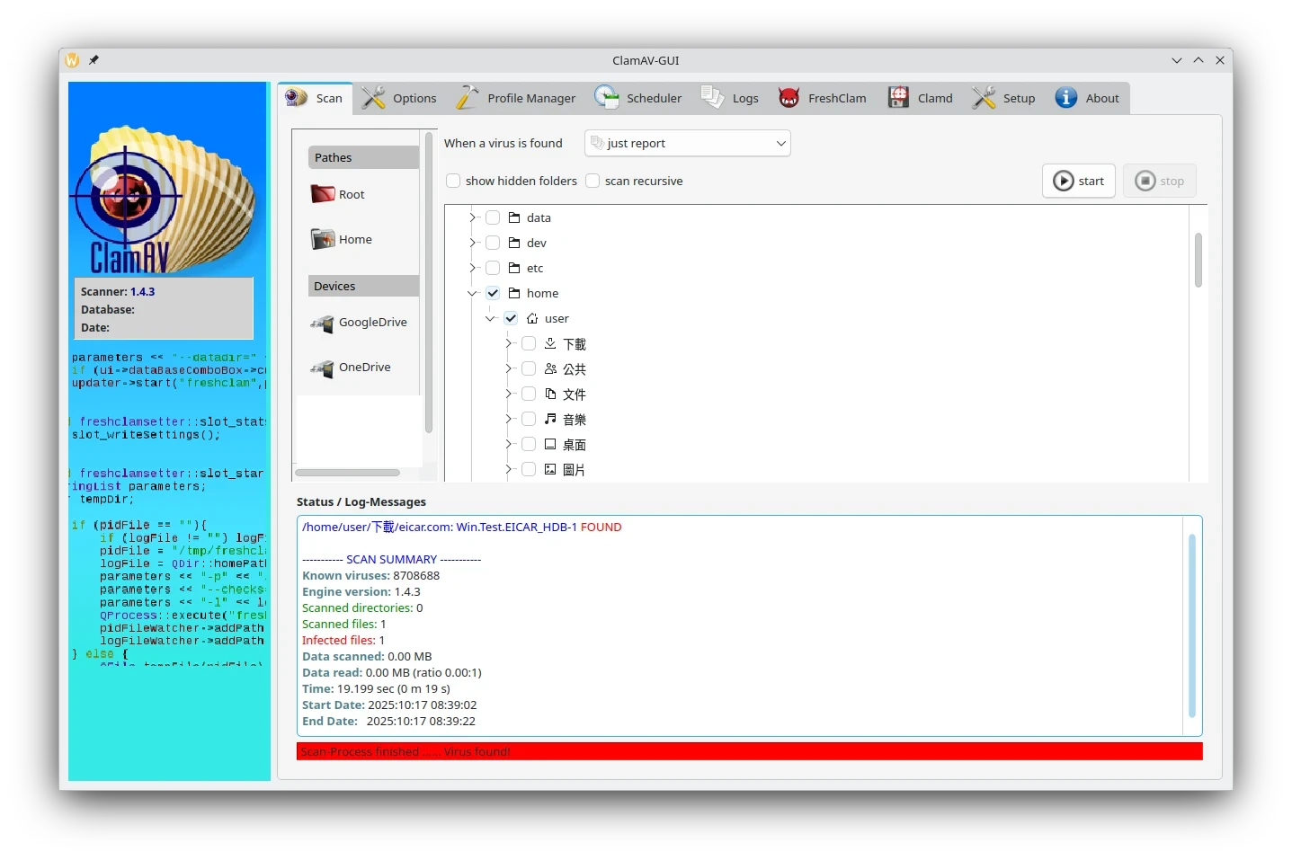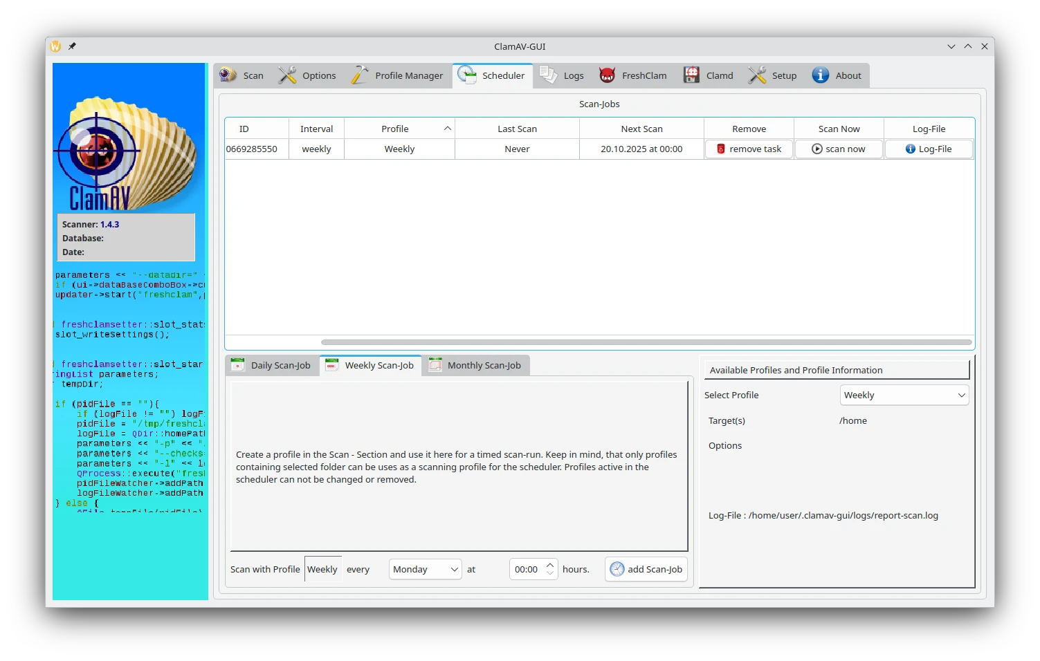 ClamAV-GUI是使用QT寫成的前端,現由UALinux公司維護,功能選單齊全。安心吧,這個GUI設計的樸實無華,沒有什麼「安全體檢」分數給你製造無謂的焦慮,只有實用的排程掃描按鈕。