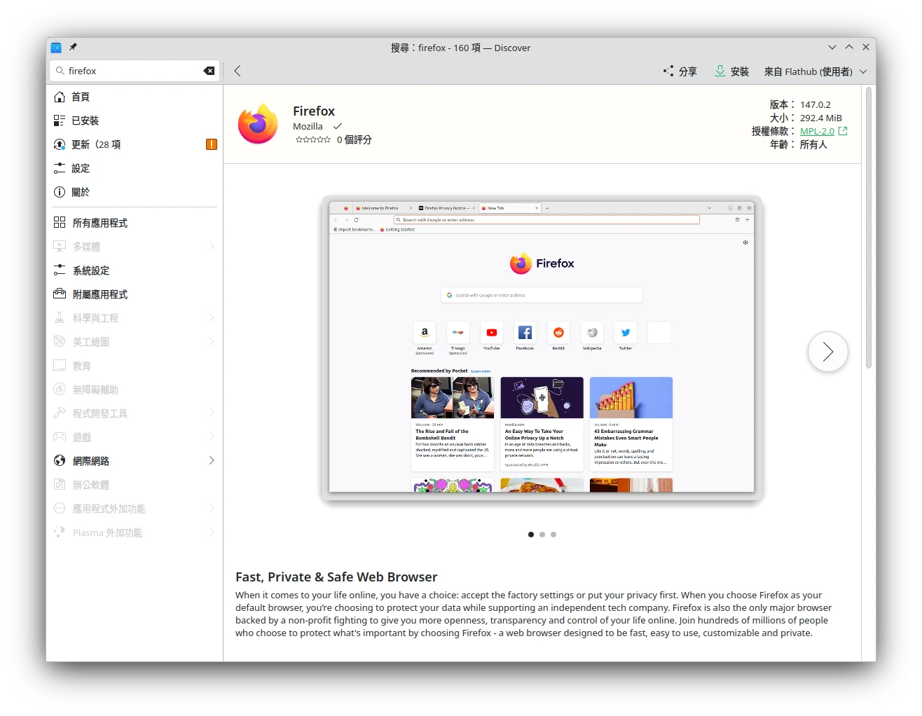 sudo pacman -S firefox非必要情況下,請勿用手動make install編譯的方式安裝軟體,這會導致軟體版本升級不易。建議優先嘗試應用程式商店和套件管理員來安裝軟體。