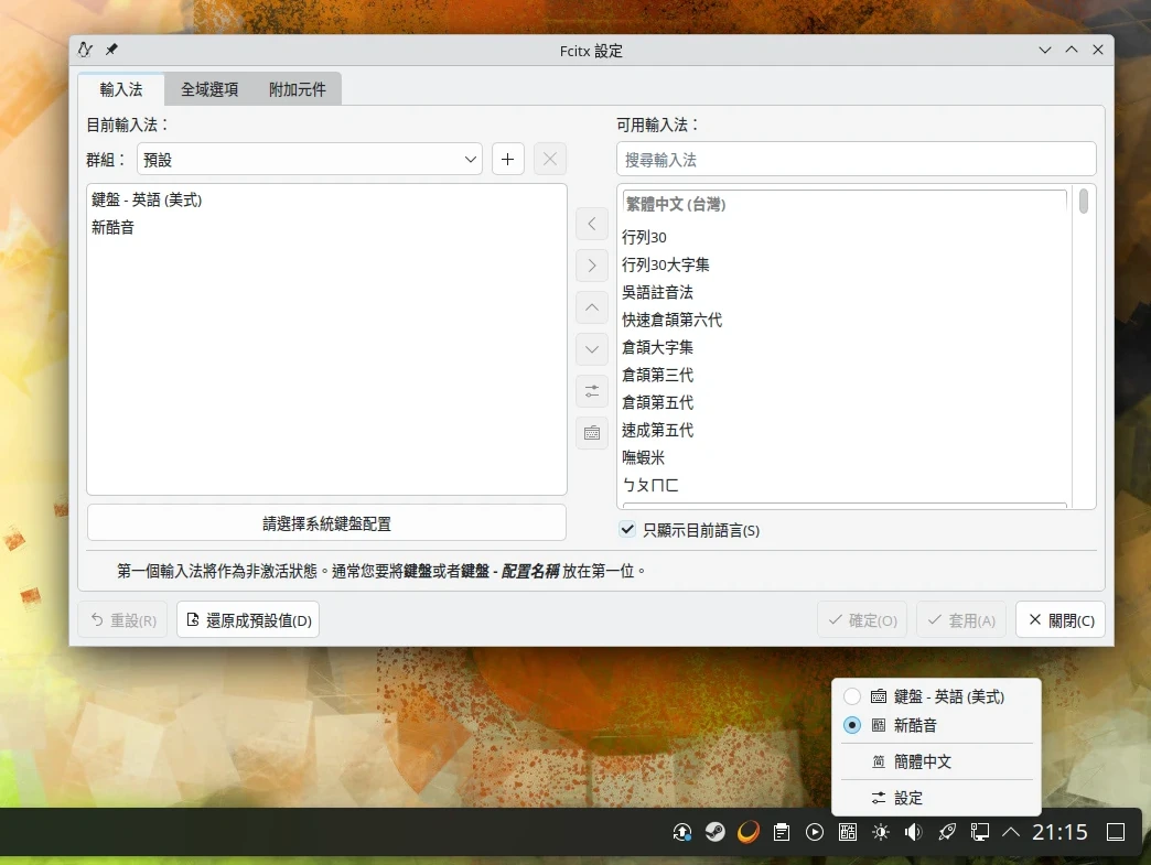 | Fcitx5 小企鵝 | 輸入法框架,支援搭配注音(新酷音、小麥、RIME)、漢語拼音、雙拼、五筆、倉頡、嘸蝦米、日文(Mozc, Anthy)、韓文(Hangul)、越南文(Unikey, Bamboo)使用,支援繁簡轉換。 詳細使用方法 |