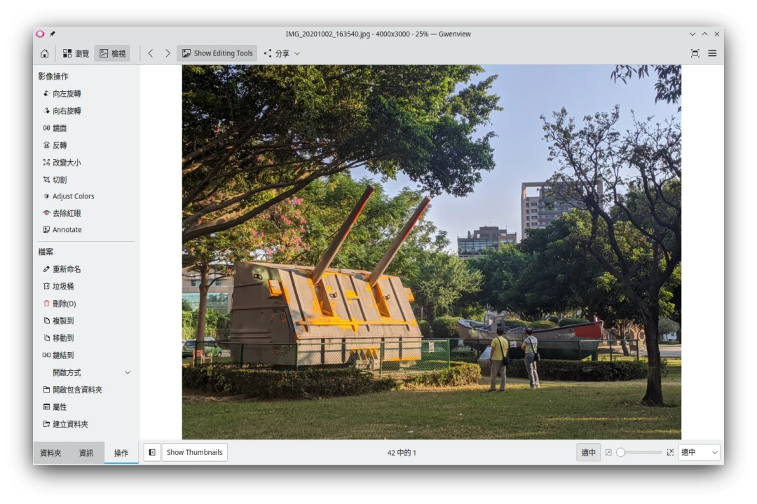 | Gwenview | KDE開發的看圖軟體,除了常見的圖片格式外還支援.webp、.avif、.heic格式,能夠檢視EXIF資訊。可簡單編輯圖片和加文字,支援讀取壓縮檔的圖片。 |