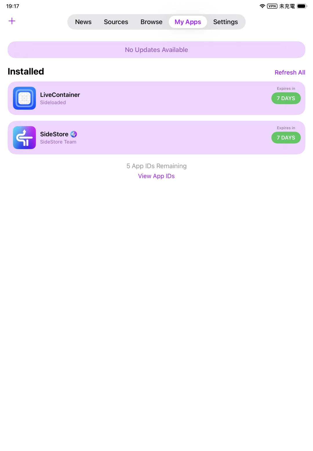 這是JIT-Less模式的變種。將SideStore內建在LiveContainer裡面,這樣的話它就能夠在一個APP裡面自己幫自己完成簽名了。不過你要安裝IPA的話還是要用LiveContainer主界面安裝,這裡SideStore只是負責幫LiveContainer簽名,防止7天後過期而已。