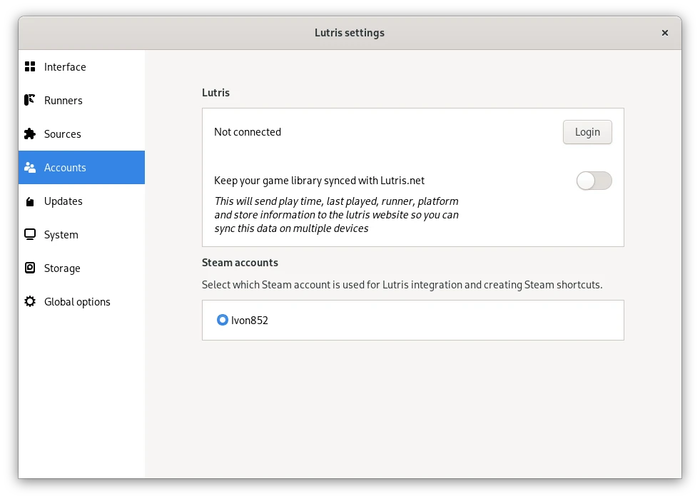 點右上角 → Preferences → Accounts,點Login登入Lutris帳號,再點選Sync。