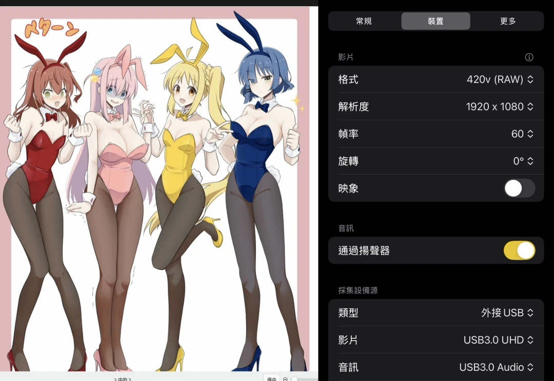 擷取卡APP輸出結果(上)跟iOS的照片(下)顏色對比一下,可以發現嚴重的不對稱。擷取卡的顏色在DCI-P3色域的螢幕上被漂白了。