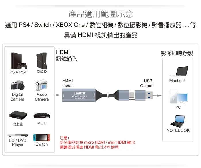 擷取卡的用途為何?這個擷取卡一端是HDMI母頭,另外一邊是USB公頭只要支援USB的裝置都能用。典型的連接方法: