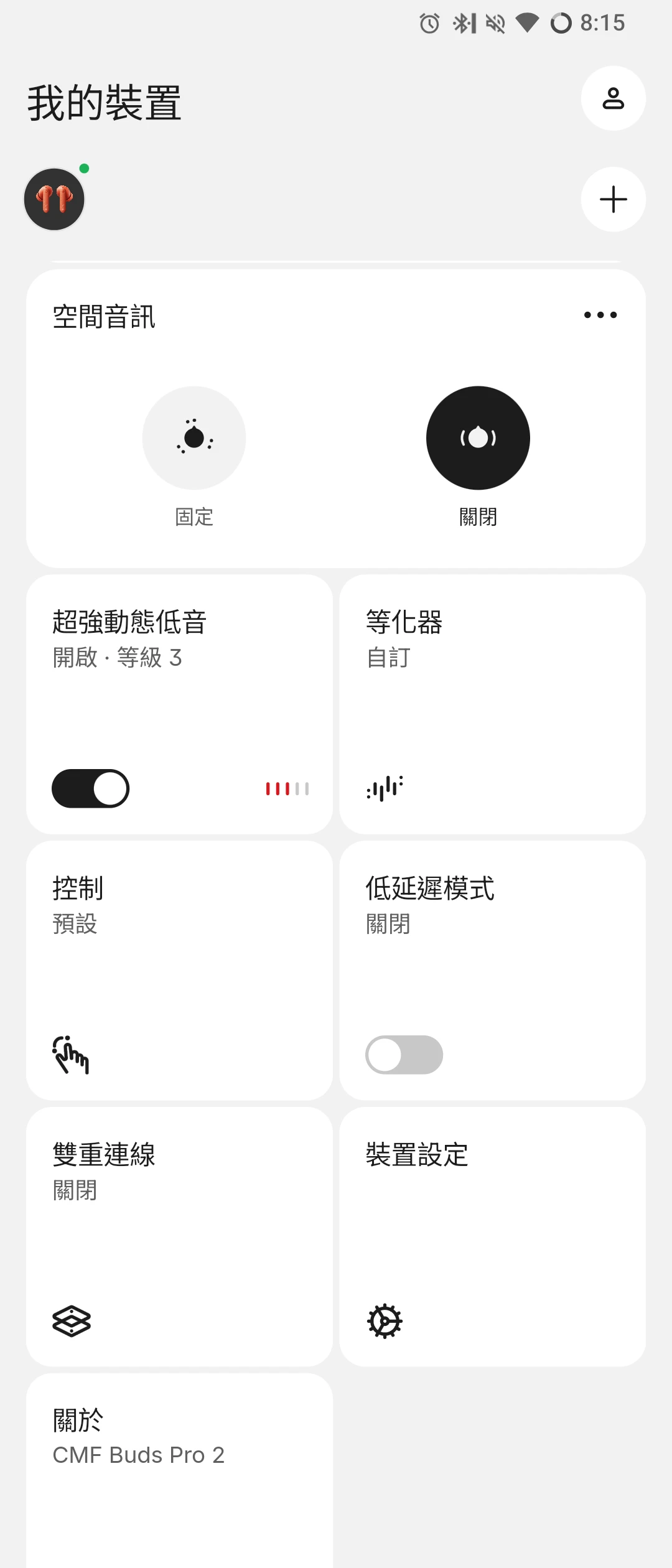 CMF Buds Pro 2的APP有一些音效功能,「超強動態低音」和「空間音訊」我覺得沒什麼特別的。等化器的話可以稍微改善不同種類音樂的聽感。