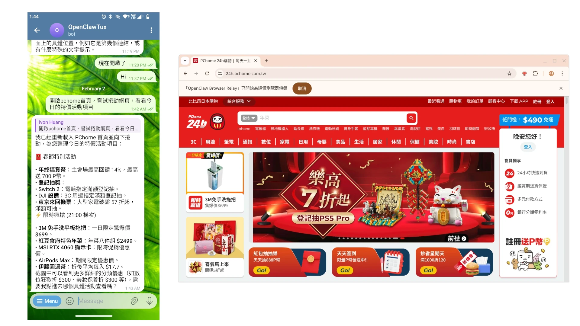 一個很普通的使用例子:叫OpenClaw打開瀏覽器,上購物網站,看看最近有什麼優惠活動,然後定期整理傳到我的手機。這寫個爬蟲程式就能辦到,根本不需要用AI吧こらぁ!當然OpenClaw能做到的遠遠不止如此,這只是最簡單的示範。