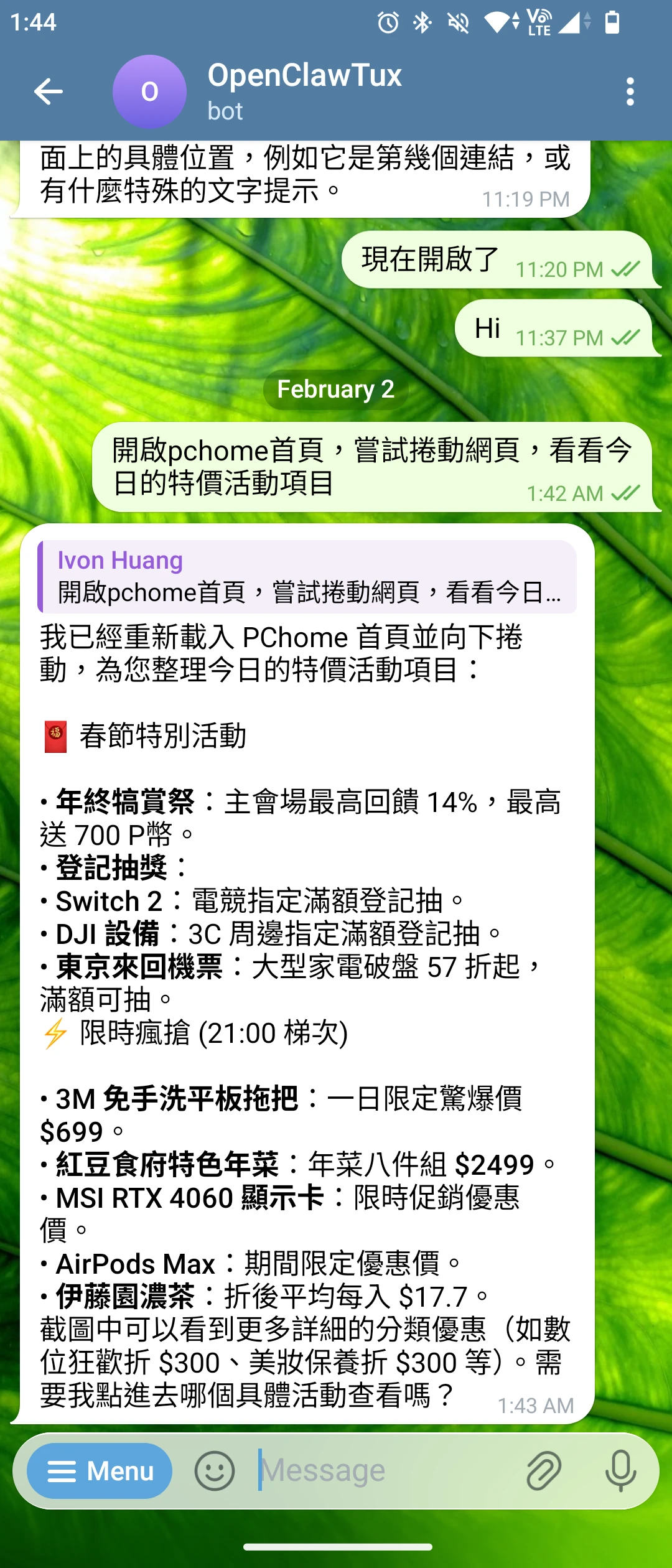 一個很普通的使用例子:叫OpenClaw打開瀏覽器,上購物網站,看看最近有什麼優惠活動,然後定期整理傳到我的手機。這寫個爬蟲程式就能辦到,根本不需要用AI吧こらぁ!當然OpenClaw能做到的遠遠不止如此,這只是最簡單的示範。
