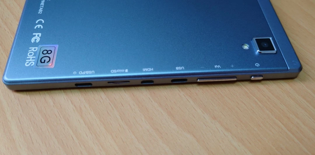 雙聲道喇叭位於平板上部。連接埠有一個Type C 3.0孔、一個Type C 2.0孔、一個MicroHDMI孔、一個SD卡卡槽、3.5mm耳機孔、連接鍵盤用的5 pin pogo。