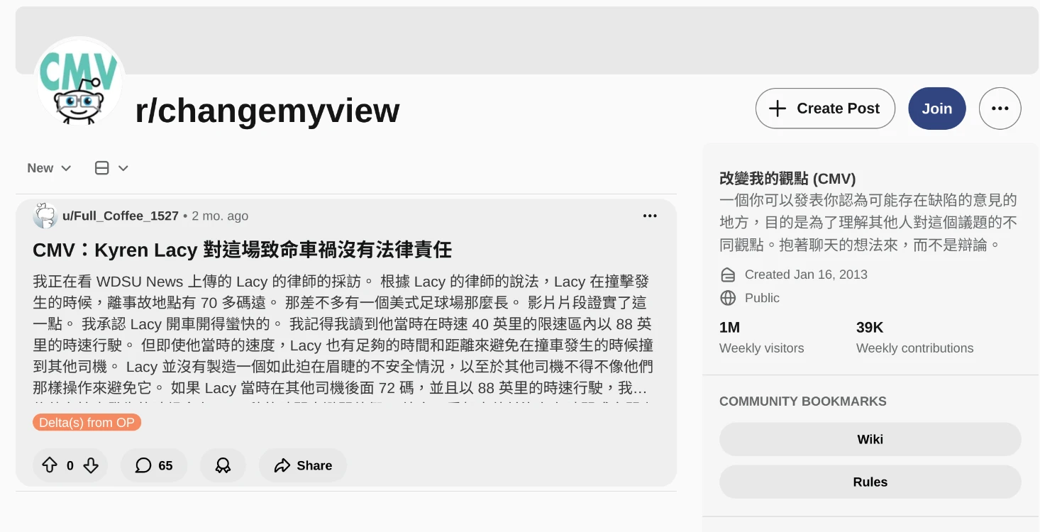 Reddit翻譯機制是在貼文網址結尾加上?tl=語言代碼。在造訪特定sub的時候也有效,例如https://www.reddit.com/r/changemyview/?tl=zh-hant