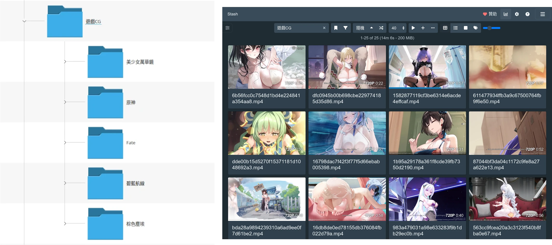 我認為很方便的地方在於,Stash允許你混合資料夾以及網頁整理影片的模式。比如說,我可以先在硬碟用「成人片」「裏番」「遊戲CG」大致將影片分類,再丟給Stash掃描。然後在Stash裡面直接搜尋資料夾名字,列出該資料夾下所有子資料夾的檔案,將不同資料夾的影片放在同一個畫面檢視,還能隨機排序。