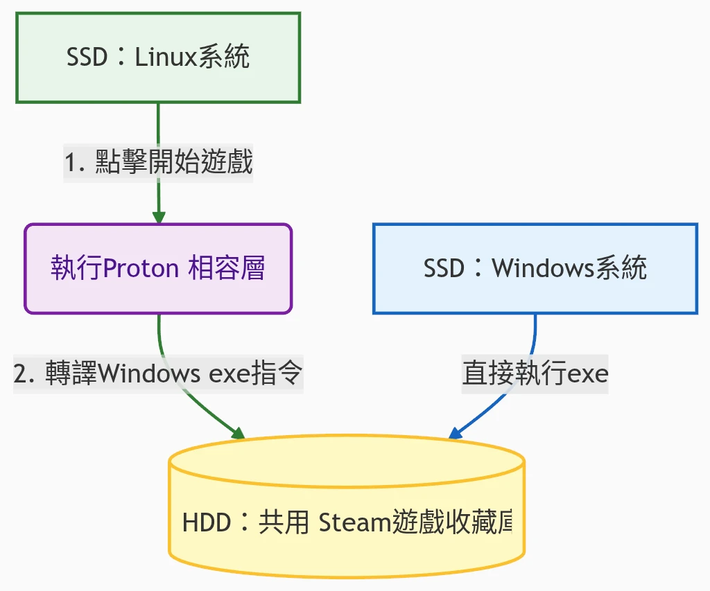 假設下載的都是Windows版的遊戲,Linux系統的Steam執行遊戲的時候,除了下載exe外,只是多建立了Proton prefix環境。換到Windows系統的Steam執行,同樣的檔案不用再下載一次,可以直接啟動下載好的exe。
