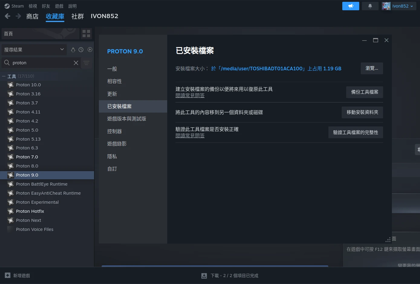 這個時候在收藏庫搜尋使用的Proton版本 → 右鍵 → 內容 → 已安裝檔案 → 驗證工具檔案的完整性,讓它自動修復。