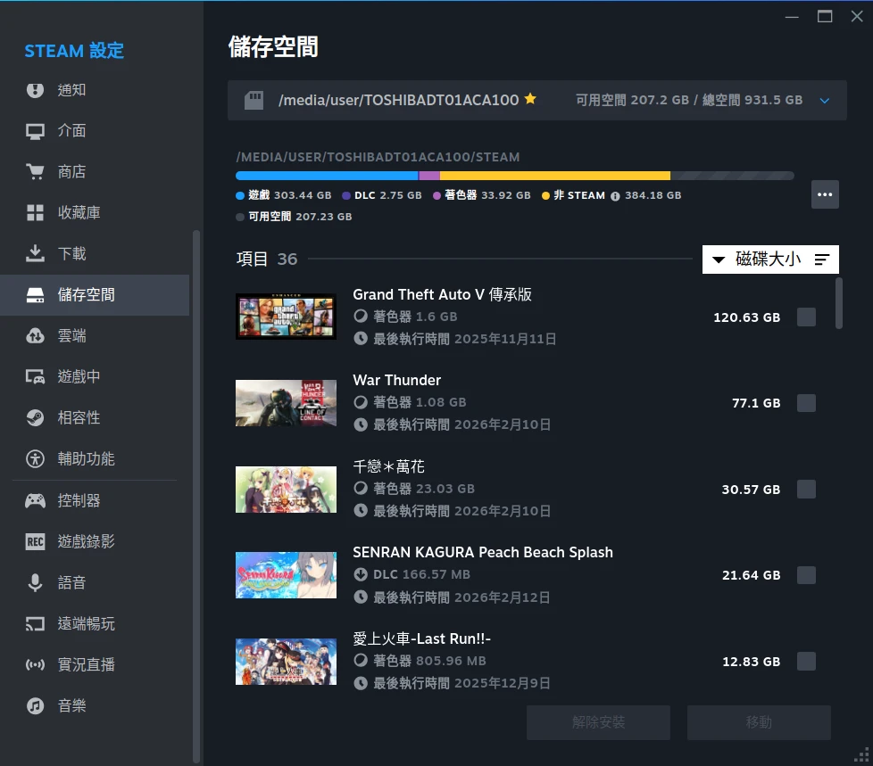 用來裝Steam遊戲的硬碟,格式化為NTFS或BTRFS都可以。雖然有人認為BTRFS會降低HDD效能,但我用起來覺得沒差。