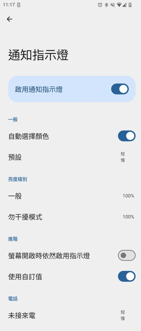 手機右上角的硬體LED指示燈要到系統設定 → 通知 → 通知指示燈開啟。這裡能夠自訂個別APP通知所使用的顏色。