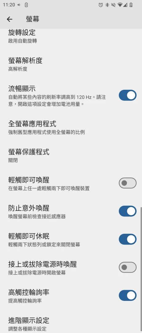 開啟系統設定 → 顯示,「流暢顯示」就是120Hz,「進階顯示設定」裡面有導演模式。「螢幕解析度」可以切換1080p與4K解析度,不知為何設定4K解析度DPI不會跟著變,要到開發人員選項 → 最小寬度設定為400。