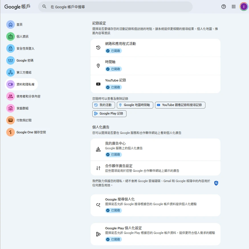 這些追蹤選項全部都重新打開,才能享受到Google生態系帶來的個人化便利服務。Google目前的隱私政策已經是在被歐盟瘋狂罰錢後調整過的了,你不要再delusion了啦!