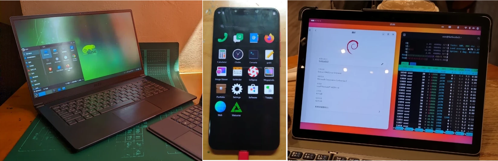 分別是小米Poco F1 + postmarketOS、Microsoft Surface Go 2 + Debian、MSI Modern 15 + Fedora。