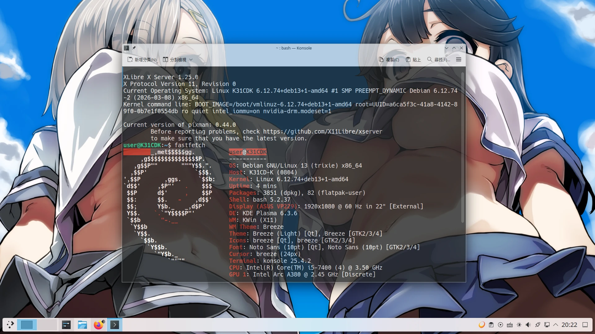 透過backport安裝了Linux Kernel 6.19,看來上游修好了Linux Kernel 6.12的Intel Arc驅動會導致虛擬機VirGL畫面雜訊的問題。不過換Xe核心模組還是有機率會crash掉KDE,所以還是待在i915為妙。