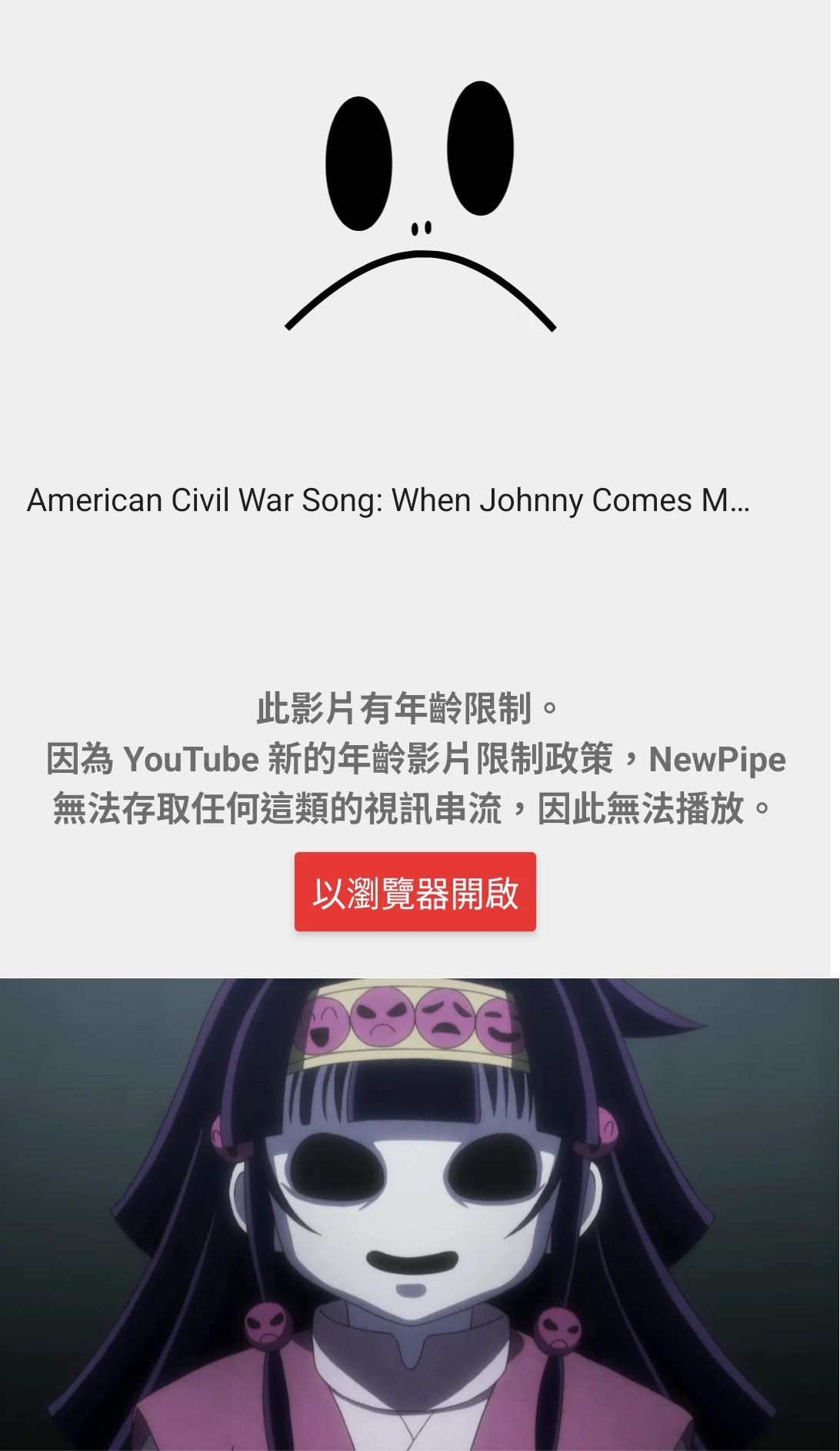 圖片 經過Mastodon象友提及,產生無端聯想:NewPipe解析年齡限制的影片會失敗,出現一張哭臉,有人覺得這個黑瞳孔白面部的配色很恐怖?那算什麼!若想到《獵人》裡面的黑暗大陸版阿路加.揍敵客喔,那才可怕。富堅老師真的很會畫出那種詭異恐怖的感覺。