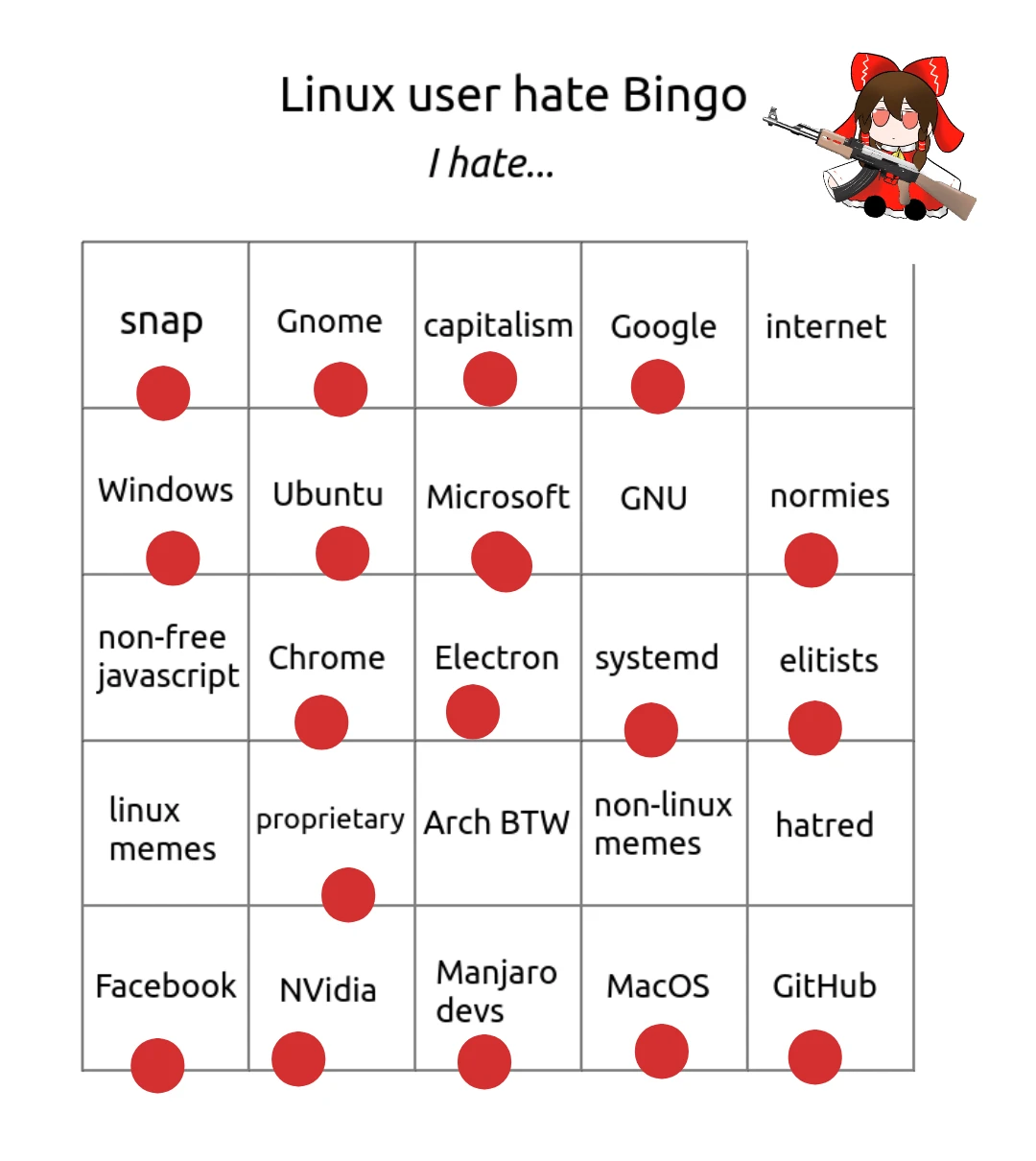 Linux User Hate Bingo. What do YOU hate today? 科技憎恨圈bingo,全部打勾的這輩子真的有了。以下是我的bingo結果:圖片。身為(魔怔)的偏好Unix哲學的Linux用戶,總會討厭一些主流的科技玩意,例如Microsoft和Google推行的東西。因為愛屋及烏的緣故,加上Github拿自由軟體去餵AI,所以Github我也討厭,正在考慮使用Codeberg。用Electron開發APP和使用Electron的APP的也應該下地獄,例如VSCode。應該用原生框架寫的編輯器不然就用Vim。另外我討厭菁英主義者,也討厭normie。討厭資本主義還有Nvidia。