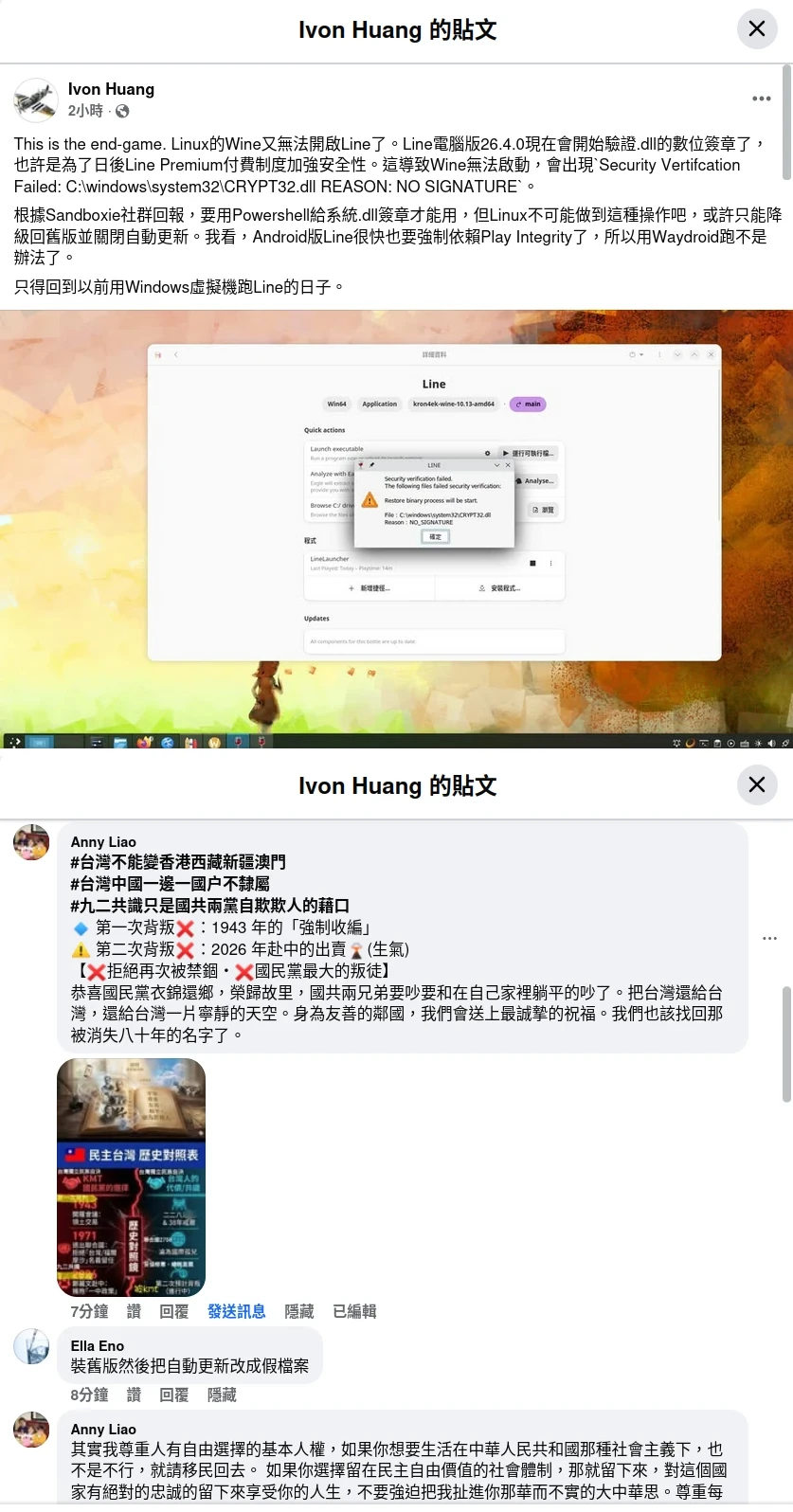 Security Vertifcation Failed: C:\windows\system32\CRYPT32.dll REASON: NO SIGNATURE。LINE fails to launch, reporting unable to verify msimg32.dll for the reason of NO_SIGNATURE #5306 根據Sandboxie社群回報,要用Powershell給系統.dll簽章才能用,但Linux不可能做到這種操作吧,或許只能降級回舊版並關閉自動更新。我看,Android版Line很快也要強制依賴Play Integrity了,所以用Waydroid跑不是辦法了。只得回到以前用Windows虛擬機跑Line的日子。 20260409
