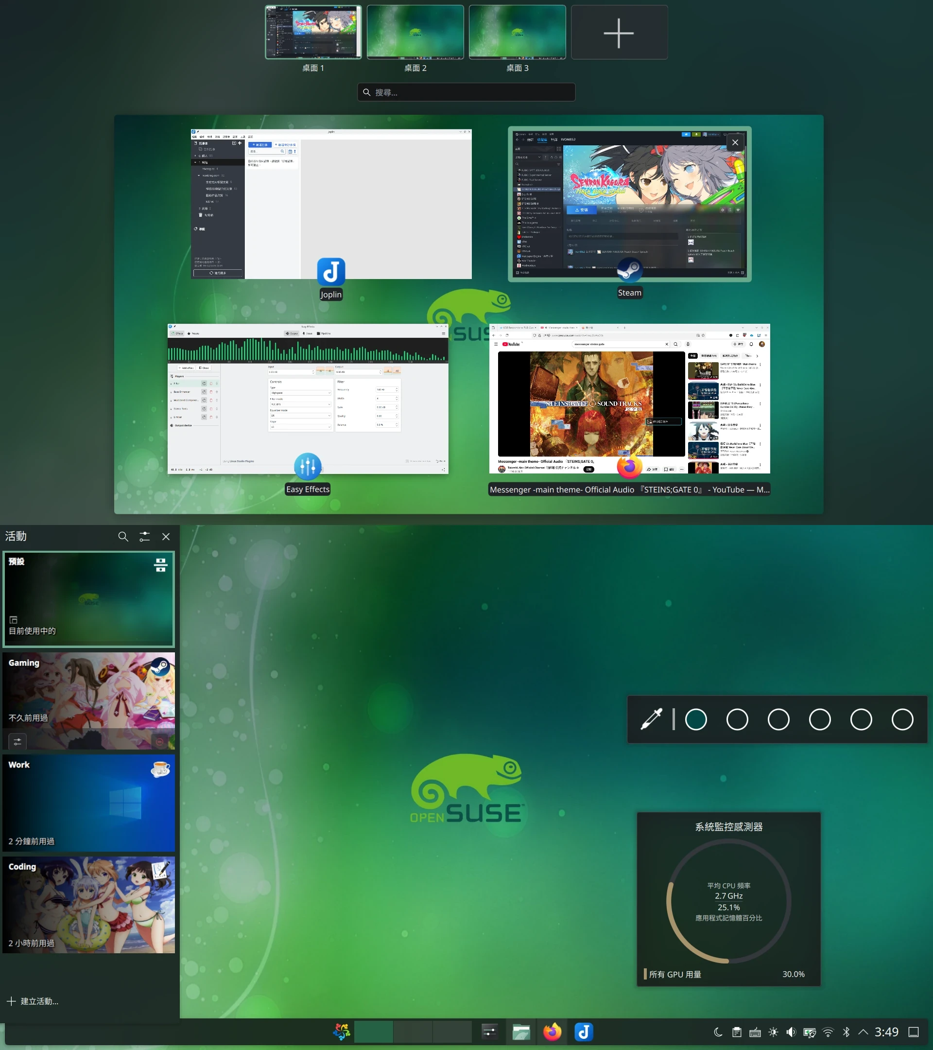 圖片 如果要你設計虛擬桌面,你會選擇圖一的工作區模式,還是圖二的活動切換樣式呢?操作電腦的時候,多工時開啟一堆程式,導致視窗難以管理是常見的問題,Windows的解法是虛擬桌面,macOS是指揮中心。至於Linux的KDE桌面,有兩種整理視窗的解決方案,分為「工作區」與「活動」。KDE的活動是比虛擬桌面還要全面的工作流管理,讓你不只是管理畫面上的視窗排列而已,還可以將使用中的多個程式儲存為一個集合,方便快速切換。這個功能有點類似瀏覽器的profile功能,但是使用者程式資料又不是完全隔離的。但是,KDE 6之後,活動(Activities)這個功能似乎被改廢了。根據布丁布丁吃什麼的文章,KDE的螢幕、桌面跟活動有什麼不同?,KDE 5時代還有自訂每個活動的桌面配置的功能,每個桌面可以有自己的工作列、主題、電源設定,在切換活動面板之後會suspend程式,達成比工作區(Workspace)的模式更為全面的工作流切換。現在只剩下換桌布和桌面小工具了,那跟工作區就相差無幾了呀,而且KDE 6還從GNOME 46抄來了工作區縮圖總覽、點左上角預覽所有視窗,讓Activities的存在顯得雞肋。Nate - What’s going on with Activities in Plasma 6? 2024年KDE開發者提案移除Activities功能,結果一堆人跳出來反對,因此作罷。看來他們很缺人手,這個功能雖然暫時不會移除,但是bug太多了。Deprecate and remove Activities 針對Activities的提案討論有很多改進法,例如讓KDE利用systemd-homed新推出的area隔離使用者設定檔。不過沒有採納。最新的commit甚至把Activities這個功能列為編譯KDE時可關閉的選項了。