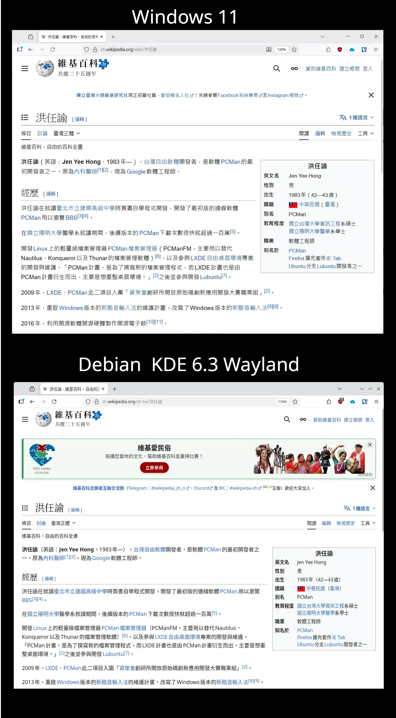 有人跟我說Fcitx5打注音字會自己卡住,我想說跟我講幹嘛,我從來沒有這情況…嗯嗯,我確實觀察到這個現象了。僅限Firefox + Facebook文字框的時候會卡頓。有時候排版還會亂掉。Chromium系列的沒有這問題。Fcitcx5不會崩潰也沒有CPU佔用過高的現象,所以問題在網頁比較大。這個時候就要怪祖克伯了,這些現代網頁的開發者真的都沒在詳細測試Chrome和Safari以外瀏覽器的相容性了。