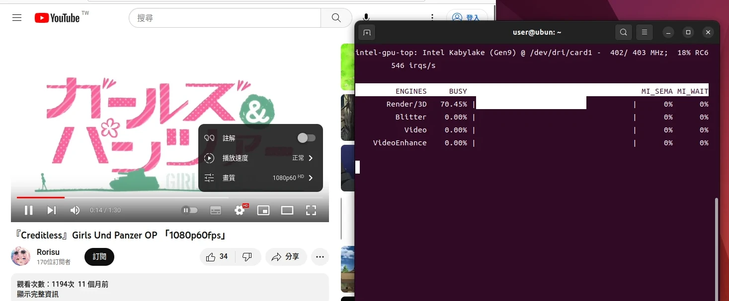 安裝intel-gpu-tools,再執行sudo intel_gpu_top可監控Intel顯示卡有沒有真的跑起來。