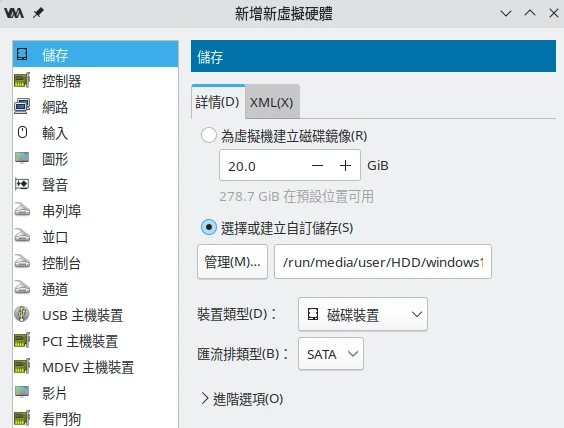 開啟Virt Manager,點選左上角新增機器,跳過新增儲存。作業系統選擇