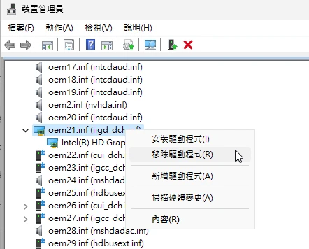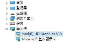 開啟裝置管理員,對Intel UHD 630 點右鍵 → 解除安裝裝置 → 裝置(依驅動程式),右鍵強制移除