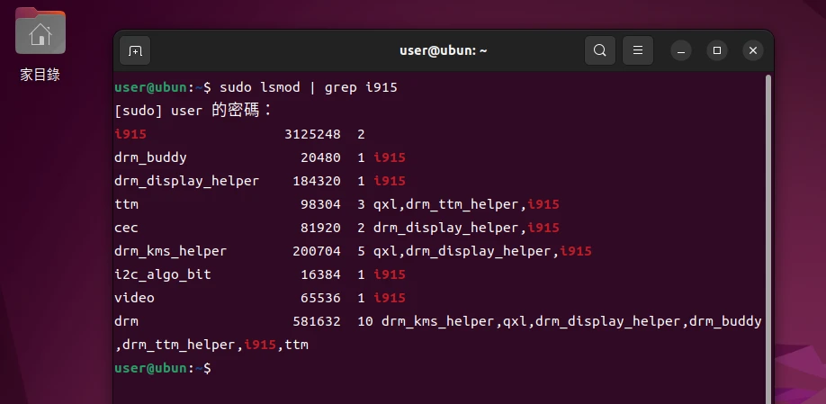 用指令sudo losmod | grep i915確認i915核心模組有載入