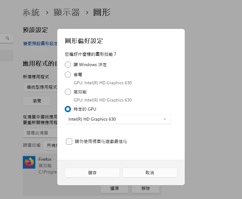開啟系統 → 顯示器 → 圖形,選取應用程式exe,指定使用Intel顯示卡運算。