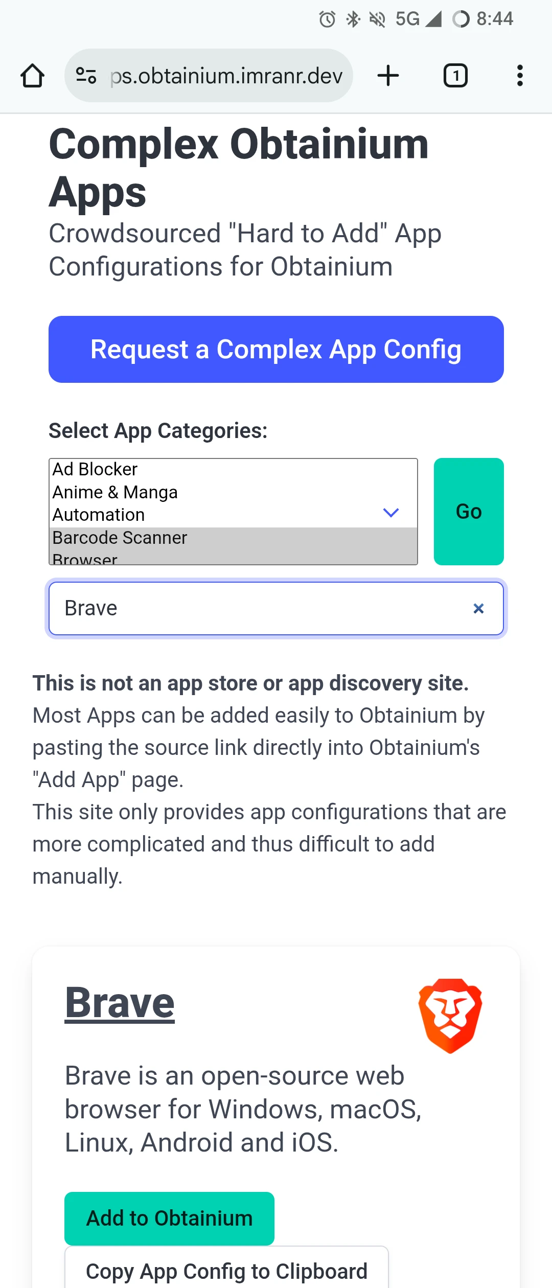 如果要你安裝的APP頁面提供多種版本、混雜多種架構的APK,致使Obtainium會抓錯的話,你可以到Complex Obtainium Apps下載作者寫好的設定檔,匯入後會自動設定好正則表達式。比如,Brave瀏覽器就需要借助這裡的JSON設定檔才能正常下載。