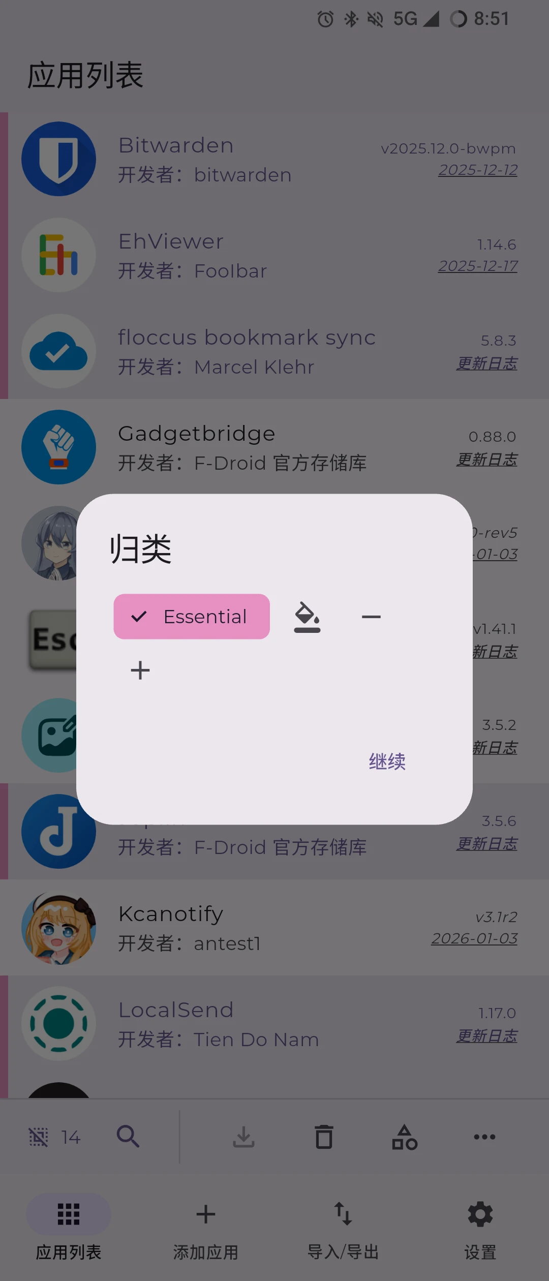 我的作法是會給一些APP長按,加上「Essential」的分類。這樣我換手機的時候就會知道要優先下載哪些APP。透過Obtainium,我能夠做到不依賴Play商店來快速部署這些APP。至於其他APP的則是可有可無的狀態,等到我確定會長期使用後再加入Essential列表。