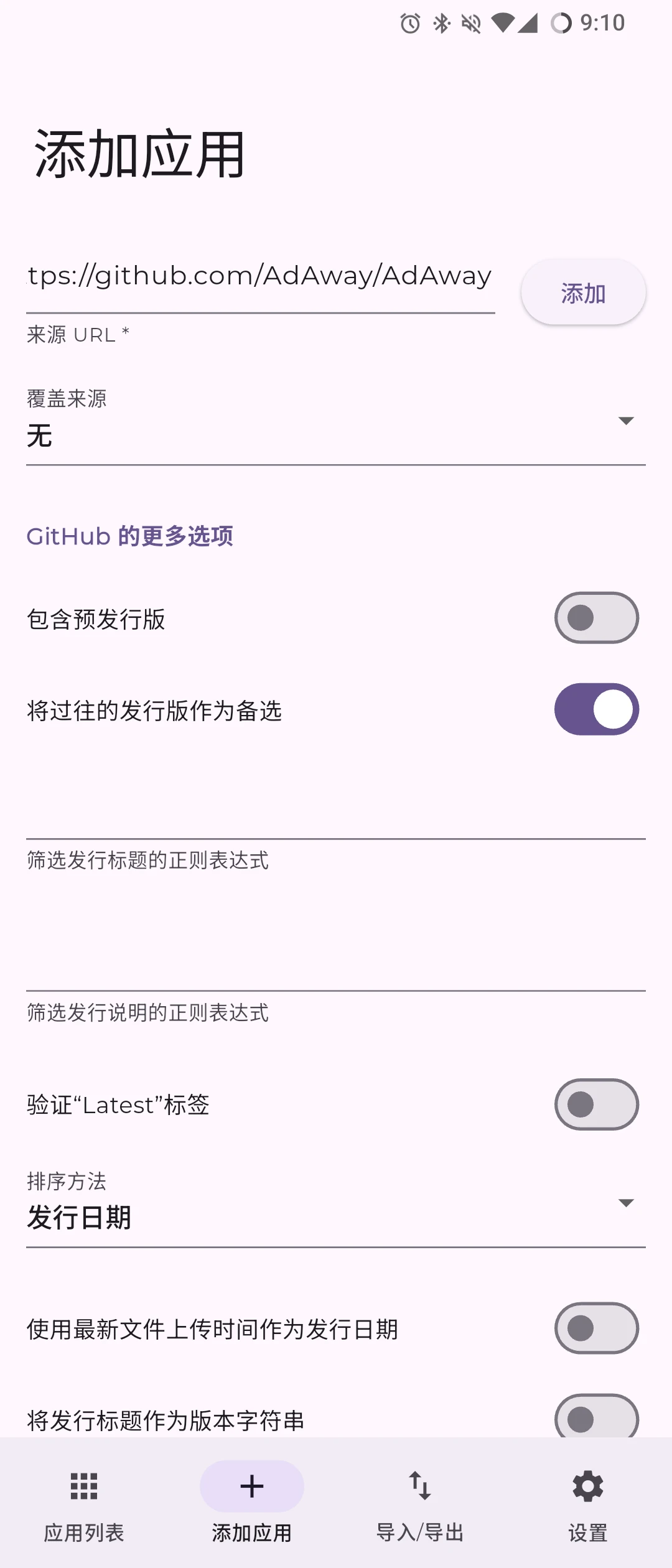 開啟Obtainium,點選添加應用,輸入APP的網址。此處以Adaway為例,只要填入Github專案的主頁面網址即可。