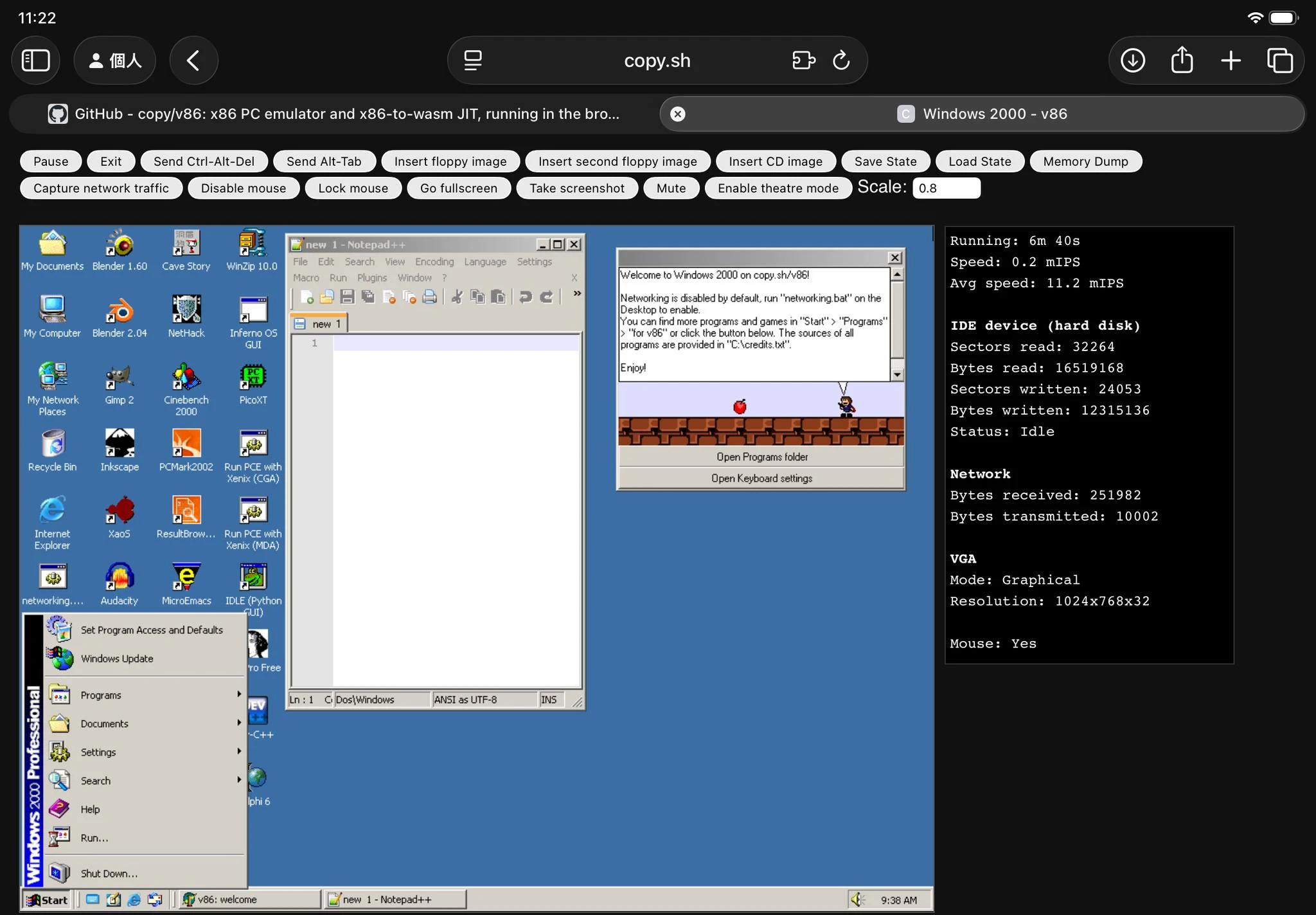 這不是用網頁框架模擬Windows介面,也不是遠端桌面,而是真正的在瀏覽器載入ISO開機,進入完整作業系統。原理是在瀏覽器裡面模擬x86架構的CPU,將機器碼翻譯為WebAssembly執行,並且實現了JIT加速。