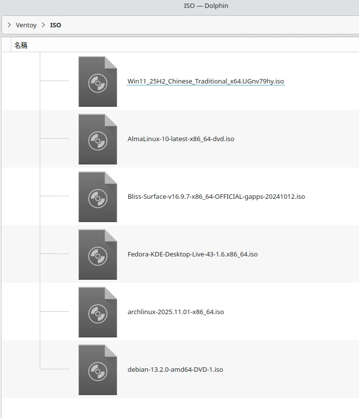 可自由使用的是另一塊較大的空間Ventoy,這裡就是能自由儲存資料的分區。系統ISO直接放這裡就行了,例如我放了Windows和Linux的ISO,Ventoy開機會自動偵測。即使放在資料夾裡面也讀得到。