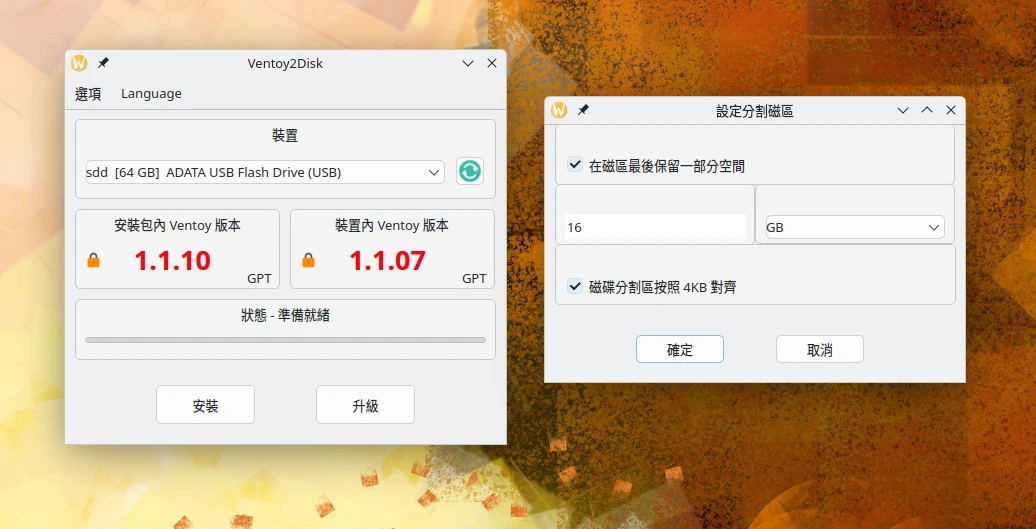 Unable to access Ventoy... /dev/sdx is already mounted or mount point busy.的錯誤。這時只要點選選項 → 設定分割磁區,在磁碟後端預留空間即可。這樣Ventoy除了放ISO的分區外,還會多出一塊分區能夠儲存資料,並且該分區能在LiveUSB存取。