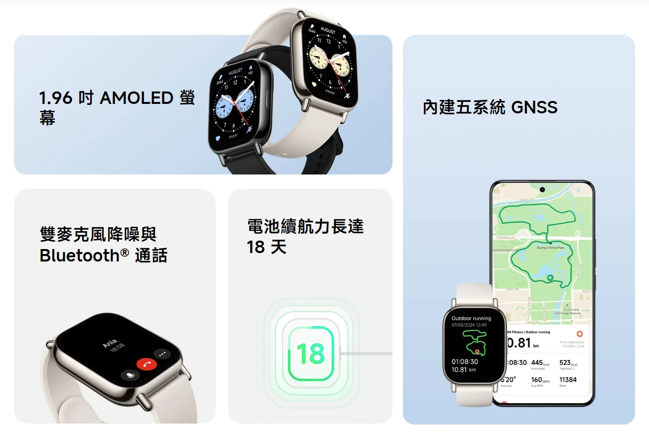 Redmi Watch 5 Lite的功能主要為運動以及定位相關,可以偵測運動模式、獨立繪製GPS路徑圖、轉接手機的電話、當作藍牙拍照遙控器、控制手機播放的音樂。
